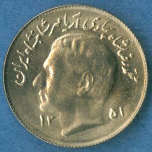 This specimen was issued by Iran as part of the F.A.O. series. This type was issued in 1971-75. One of the shah's acts that enraged his many enemies was to place his portrait on the coinage, a sacrilege according to strictest Islam.