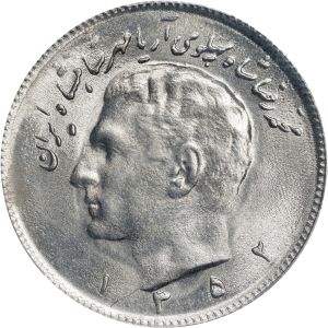 This specimen was lot 75685 in Stack's Bowers Collectors Choice Online Auction (Costa Mesa, CA, February 2025), where it sold for $85. The catalog description[1] noted, "IRAN. 10 Rials, SH 1352 (1973). Tehran Mint. Muhammad Reza Pahlavi. PCGS MS-65." This type was struck SH 1345-1352 and has the denomination spelled "ده﷼" (ten rials) on the reverse. The reverse was modified mid year so that the denomination was spelled "ريال١٠" (KM 1179, 10 rials) and struck in that form until MS 2537. The shah was overthrown in 1979 and he died the next year.