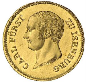 This specimen was lot 684 in Stack's "Vermuele, Ward & Mexico Maxico" sale (New York, January 2010), where it did not sell. The catalog description[1] noted, "GERMAN STATES. ISENBURG. Carl of Isenburg-Birstein, 1803-1815. 2 Ducats, 1811. Bare head of Napoleon's ally l. by J. Laroque. Rv. Wide Arms on mantle divides date, DUCAT appears below, though this coin's weight is that of 2 Ducats, 6.96 grams. Marvelous prooflike flash distinguishes this rarity, one of a mere handful struck. Prince Carl was one of Napoleon's few real German allies and suffered accordingly, his enlarged Duchy being assigned to Hesse-Darmstadt by the Congress of Vienna. He is also remembered as the innocent patron of famed counterfeiter of ancient coins, Karl Wilhelm Becker. MS-62 (NGC)." The SCWC notes that two ducat pieces were struck usng one ducat dies; both denominations are rare. Silver patterns are also mentioned (KM Pn6). The prince also struck thalers, 12 kreuzers and 6 kreuzers in 1811, also scarce.