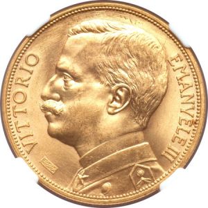 The first specimen was lot 25064 in Heritage sale 3024 (Chicago, April 2013), where it sold for $12,925. The catalog description[1] noted, "Vittorio Emanuele III gold 100 Lire 1912-R, MS64 NGC, a gorgeous coin with full glowing mint brilliance and exceptional surfaces, far superior to most seen in the market." The second specimen was lot 24623 in Heritage sale 3030 (New York, January 2014), where it sold for $7,050. The catalog description[2] noted, "Vittorio Emanuele III gold 100 Lire 1912-R, MS63+ PCGS, lightly toned and original with full mint luster and mild surface abrasions." This rare type was issued in 1910, 1912 and 1926-27 only. Several countries, including France, Spain, Venezuela and Great Britain, issued large gold coins around the turn of the century to celebrate the permanence of the gold standard, to be shattered a few years later by World War One.