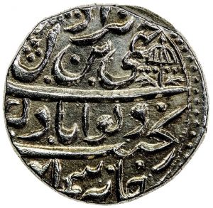 This specimen was lot 2183 in Stephen Album sale 27 (Santa Rosa, CA, January 2017), where it sold for $99.87. The catalog description[1] noted, "JAMMU: Ranjit Dev, 1742-1780, AR rupee, Dar al-Aman Jammun, VS1841 year 27. Ornate umbrella at upper right corner of obverse, EF to About Unc, ex Paul Stevens Collection." Years 27 and 28 are the only listed in the SCWC. Jammu was later absorbed into Kashmir and its coinage ceased.