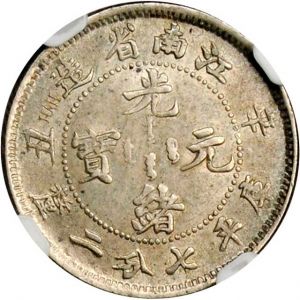 The specimen shown was lot 21394 in Ponterio sale 165 (Hong Kong, April 2012), where it sold for US$1135. The catalog description[1] noted, "CHINA. Kiangnan. 7.2 Candareens (10 Cents), CD (1901). NGC MS-62. 辛丑江南省造光緒元寶七分二厘銀幣。 "HAH"。NGC MS-62.”