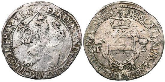 "LIEGE, Principauté, Ferdinand de Bavière (1612-1650), AR demi-daler au lion de 15 patards, 1614, Hasselt. D/ Lion couronné deb. à g., ten. une épée et un écu de Bavière. R/ Ecu de Bouillon dans un cartouche couronné, accosté de F-B sous deux couronnelles. En dessous, XV-1614. Extrêmement rare. Fine fêlure du flan. Légère faiblesse de frappe. Très Beau. Provient de la collection H. Frère, 23 mai 2002. (principality of Liège, Ferdinand of Bavaria, 1612-50, silver half daler of the lion of fifteen patards of 1614, Hasselt mint. Obverse: crowned lion left, holding a sword and the arms of Bavaria; reverse: arms of Bavaria in a crowned cartouche dividing crowned initials "FB", date and value below. Slightly weakly struck, Very Fine.)"