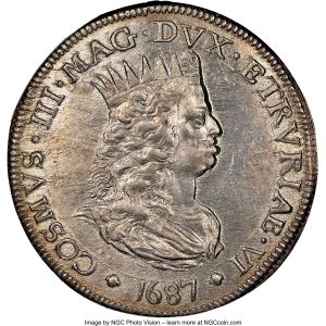 This specimen was lot 34018 in Heritage sale 3098 (New York, January 2022), where it sold for $3,120. The catalog description[1] noted, "Italy: Livorno. Cosimo III de'Medici Tallero 1687 MS63 NGC, Livorno mint. The sole certified example of this date at NGC, and perhaps the finest of all examples that we could locate having sold publicly in the last decade based on photographic comparison. Decorated in a bright sheet of rolling argent luster that sparkles intensely across micro-granular flow lines which contour the devices and peripheral legends, this choice conditional rarity is further notable for its use as the "plate coin" in NGC's online price guide." This type was struck by the Medici Grand Duke of Tuscany for Livorno 1683-1700. The Italian word tollero may be translated into the German word thaler or the English word dollar.