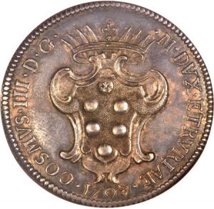 This specimen was lot 24977 in Heritage sale 3024 (Chicago, April 2013), where it sold for $3,525. The catalog description[1] noted, "Livorno. Cosimo III Medici Pezza Della Rosa 1703, AU58 NGC, a choice example of this very popular type with well-struck details and rich old-time patina - highly attractive!" This type is noted for 1701-18 and is rather expensive.
