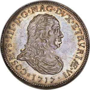 This specimen was lot 32285 in Heritage sale 3041 (Chicago, August 2015), where it sold for $4,700. The catalog description[1] noted, "Livorno. Cosimo III Tallero 1717 MS64 NGC. This massive selection displays absolutely choice, gunmetal patina along with an exciting amount of iridescent amber that encircles the portrait of the Grand Duke and completely envelopes the Fortress of Livorno motif. Upon closer inspection, the crispness of the design elements is even more apparent, with only a bit of softness noted upon Cosimo's facial features. A truly ideal representative of this short-lived type that has been extremely well-preserved over the last few centuries." This type was struck by the Medici Grand Duke of Tuscany for Livorno 1707-23. The Italian word tollero may be translated into the German word thaler or the English word dollar. After the extinction of the Medici, the duchy was ruled by the Hapsburgs, who replaced the tollero with the francescone.