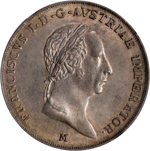 This specimen was lot 75322 in Stack's Bowers Collectors Choice sale (Costa Mesa, CA, September 2023), where it sold for $720. The catalog description[1] noted, "ITALY. Lombardy-Venetia. 1/2 Scudo, 1824-M. Milan Mint. Franz I. NGC MS-63. Delightful indigo gray, amber, and pale russet iridescence decorate the surfaces of this lustrous piece. Boldly strike devices are quite free of marks or chatter, as are the smooth fields. The first we have had the privilege to present in over a decade, Italian specialists will be delighted by this offering." The kingdom of Lombardy-Venetia was assembled by the Austrians to provide a unified administration for the Italian territories under their rule. This comprised the former duchies of Milan and Mantua and the republic of Venice. Milan, under Spanish rule from the 1500's, fell to the Austrians in 1714 and held by them until 1797 when Napoleon seized it. Napoleon gave Venice (until then independent) to Austria as compensation for her loss of Milan and Belgium. The area passed back and forth between the French and Austrians until the Congress of Vienna in 1814-15, when Metternich awarded it to Austria. Austria ruled it until 1866, when it passed to the new kingdom of Italy. This type was struck at Milan 1822-24 and 1827 and is scarce. This type was also issued at Vienna 1823-25 and 1835 and from Venice 1822-27. The denomination, worth three lire, was last struck in 1853.