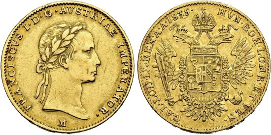 "RDR / ÖSTERREICH, Franz II. (I.), 1792-1835. 1/2 Sovrano 1835, Mailand. Sehr schön. Gereinigt. (empire of Austria, Francis II, 1792-1835, half soverain of 1835, Milan mint. Very fine, Cleaned."