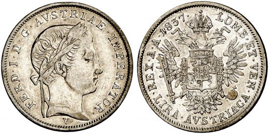 "KAISERREICH ÖSTERREICH, Ferdinand I. 1835-1848. 1 Lira 1837, V, Venedig, für die Lombardei und Venetien. RR Sehr schön. (Empire of Austria, Ferdinand I, 1835-48, lira of 1837, Venice mint, for Lombardy-Venetia. Rare, very fine.)"