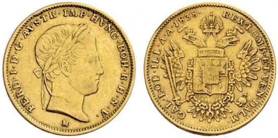 "1/2 Sovrano 1838. Mailand. Sehr schön-fast sehr schön. (Lombardy-Venetia, half sovrano of 1838, Milan mint, very fine or better.)"