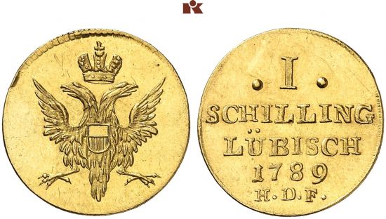 "LÜBECK, STADT, Goldabschlag zu einem 1/2 Dukaten von den Stempeln des Schillings 1789. Münzmeister Hermann Daniel Friederichsen. GOLD. Winz. Randfehler, vorzüglich. (Germany, city of Lubeck, gold off metal strike of half ducat weight using one schilling dies of 1789. A rim bump, extremely fine.)"