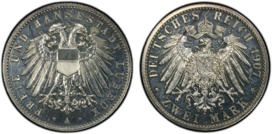 This specimen was lot 908 in Steve Album Auction 51 (Santa Rosa, CA, January 2025), where it sold for $312. The catalog description[1] noted, "LÜBECK: Free Hanseatic City, AR 2 mark, 1907-A, an attractive proof quality example, PCGS graded Proof 62, ex Joe Sedillot Collection." This type was struck 1904-07, 1911-12. It is scarce.