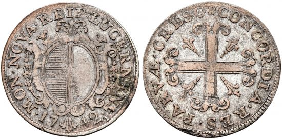"SWITZERLAND | Lucerne | Stadt und Kanton. Halbbatzen 1742, Luzern. Stempelschneider Jonas Thiébaud. Seine Initiale T auf der Vorderseite unterhalb des Wappens. Selten. Sehr schön. Flaue Prägung wie üblich. (Switzerland, canton of Luzern, half batzen of 1742, Luzern mint. Rare, Very fine, Weakly struck as usual.)"