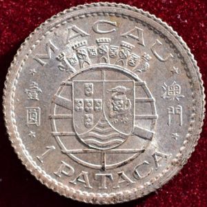 This issue was minted in Lisbon for the Portuguese colony of Macao. This date, 1952, is the inaugural year for coins minted especially for Macao. The coin is somewhat scarce and a one-year type. Unlike the other colonies of Portugal, there was never any agitation for independence but the colony was returned to China in 1999.