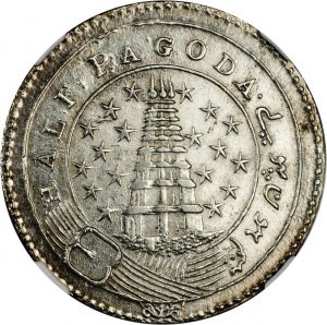 This specimen was lot 7855 in Ponterio sale 152 (New York, January 2010), where it sold for $1,150. The catalog description[1] noted, "INDIA. Madras Presidency. 1/2 Pagoda, ND (1808-11). Struck over a Mexico 1794-FM 8 Reales. Exceptional quality. NGC AU-58." Despite the large mintage, this type is scarce. The larger half pagodas attract attention from Latin American collectors as they were made from cut down Spanish colonial portrait dollars. The Madras mint, a facility of the British East India Company, minted pagodas under license from the Mughal emperor since the seventeenth century. This is the first milled type. The assets of the East India Company were transferred to the British government after the Indian Mutiny of 1857 and the mint was closed in 1869.