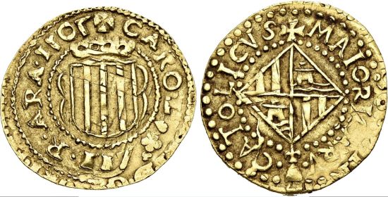 This specimen was lot 3587 in Sincona sale 83 (Zürich, May 2023), where it sold for 9,000 CHF (about US$12,045 including buyer's fees). The catalog description[1] noted, "SPANIEN, Carlos III, Pretendiente, 1700-1714. 2 Escudos 1707, Mallorca. Mit dem Münzmeisterzeichen von Gaspar de Puigdorfila. +CAROL (Rosette) III.R.ARA. 1707 (Die Ziffern 7 des Datums sind spiegelverkehrt). Rv. +MAIORICARV:(Münzmeisterzeichen):CATOLICVS. . Äusserst selten. Gutes sehr schön. Doppelschlag. Exemplar der Auktion Vico 130, Madrid, Juni 2012, Los 686. Exemplar der Slg. A. M. Huntington (HSA), 1001.1.16799 (kingdom of Spain, Charles III, pretender, 1700-14, two escudos of 1707, Mallorca mint, with the assayer's initials of Gaspar de Puigdorfila. The "7's" in the date are reversed. Extremely rare, Good very fine, Double struck)." This very rare type was accompanied by a one escudo (KM 46) and four escudos (KM 48), also very rare.