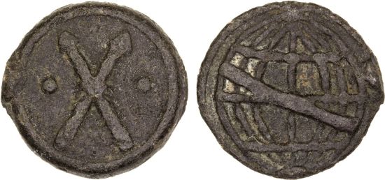 This specimen was lot 3748 in Steve Album Auction 51 (Santa Rosa, CA, January 2025), where it did not sell. The catalog description[1] noted, "PORTUGUESE MALACCA: soldo, ND (1511-1640), tin issue, crossed arrows with dots to left and right // globe, very rare type, VF-XF, RR, ex Stephen Album Price List #282." Malacca was the main port of southeast Asia in the fifteenth century, a status held by Singapore and Jakarta today. The Portuguese conquered it in 1511 and held it until losing to the Dutch in 1641, who yielded to the English in 1795. Numista says one pardao was sixty soldos. The crossed arrows indicate that this coin was struck during the reign of king Sebastian (r. 1557-78).