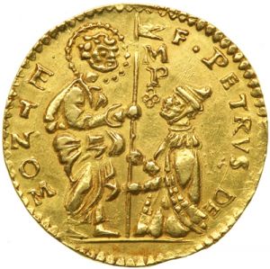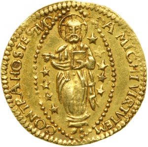 This specimen was lot 4133 in Goldberg sale 41 (Beverly Hills, May 2007), where it sold for $2,500. The catalog description noted, "Malta. Zecchino, ND. Rhodes, Knights of St. John of Jerusalem. Peter (Pierre) Del Monte, 1568-1572. Obv: Venetian ducat type. Ruler kneeling before St. John. Leg: F.PETRVS DE MONTE MP Reverse: Venetian ducat type, Christ standing. Leg: DA MICHI VIRVTEM CONTRA HOSTES TVO. NGC graded AU-55. Malta, was the home of the Knights of St. John of Jerusalem. Originally, the order was founded to protect Christian pilgrims in the Holy Land. As religious fervor waned, and the Moslems gained control of Jerusalem, the knights were left occupying just the island of Malta." The rather gruesome image of the head of the prophet on a platter appears on a number of Maltese silver coins of the early modern period. Severed heads were likely a familiar sight in Malta in the 1550's as the island endured a long siege from Turkish attackers. Grand master Jean de la Valette's heroic efforts in fending off the besiegers led to the main town being renamed for him, Valetta. Ferdinand von Hompesch was the last grand master of the knights of Malta before the Order was evicted from the island by Napoleon. The British in turn evicted the French but never returned the island to the Order, retaining it as a colony until 1964. The Order today runs charity hospitals in Europe and is headquartered in Rome. This ducat is more or less a copy of the contemporary Venetian ducats.