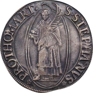 This specimen was lot 46715 in Stack's Bowers ANA sale (Oklahoma City, OK, August 2025), where it sold for $384. The catalog description[1] noted, "GERMANY. Metz. Taler, 1634. PCGS Genuine--Mount Removed, VF Details." The bishop and city of Metz both issued coins but the town was under French occupation from the mid-1500's, which occupation was formally recognized by the Treaty of Westphalia in 1648. In the eighteenth century, the town was the site of a French mint, mintmark "AA." This type is listed for 1628-34.