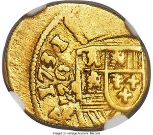 This specimen was lot 31325 in Heritage sale 3064 (Chicago, April 2018), where it sold for $5,040. The catalog description[1] noted, "Philip V gold Cob Escudo 1731 Mo-F XF45 NGC, Mexico City mint. A very rare late cob issue of Philip V, struck off-center on the obverse to the benefit of collectors, with an amazing full date that is entirely bold and takes focal prominence on the surfaces. The reverse, somewhat atypically, displays extremely broad doubling of the cross design. With their faint reddish toning accents, the surfaces certainly appear choice for the assigned grade. Selections from the Isaac Rudman Numismatic Cabinet." This specimen is a gold cob escudo struck at Mexico City the year before the conversion to milled coinage. Specimens with clear dates are unusual.