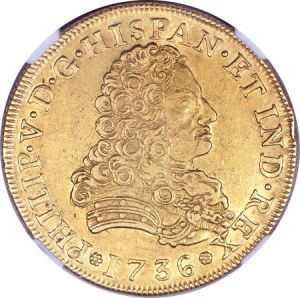 This specimen was lot 25281 in Heritage sale 3015 (Long Beach, September 2011), where it sold for $4,887.50. The catalog description[1] noted, "Felipe V gold 8 Escudos 1736-MF, XF45 NGC, lightly toned with luster in the legends, very little wear evident on the bust. A handsome example of this early type and date." This type is listed for 1732-47 and is the first milled eight escudos of Mexico. It is not particularly rare but is in high demand, so it is expensive.