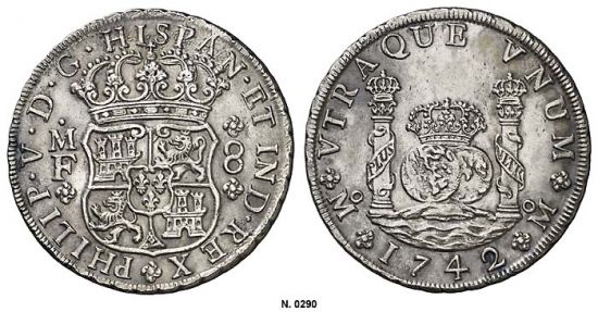 "1742/1. México. MF. 8 reales. Columnario. Pátina. Bella. Escasa así. EBC. (eight reales of 1742/1, Mexico City mint, pillar type. Toned, scarce, extremely fine.)"