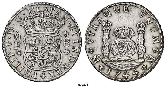 "1744. México. MF. 8 reales. Columnario. Escasa así. EBC-. (eight reales of 1744, Mexico City mint, pillar type. Scarce, about extremely fine.)"