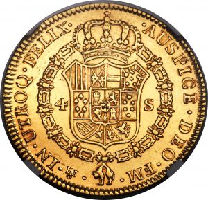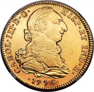 This specimen was lot 31214 in Heritage sale 3041 (Chicago, August 2015), where it sold for $1,116.25. The catalog description[1] noted, "Charles III gold 4 Escudos 1776 Mo-FM XF Details (Polished) NGC, Mexico City mint. Polished surfaces on both sides mar an otherwise well-detailed coin. A popular date with collectors in the U.S. From The Rudman Collection of Mexican Coins." All Mexican colonial gold may be considered scarce. This type, the third showing the bust of Charles III, was struck 1773-88 and is the first type that can be considered reasonably available. This date comes in two varieties; "inverted mintmark" (shown here) and "upright mintmark". The inverted mintmark variety prevailed 1773-1788; the upright mintmark appeared 1772-73 and 1788 only.