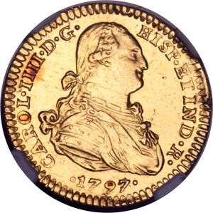 This specimen was lot 31294 in Heritage sale 3041 (Chicago, August 2015), where it sold for $293.75. The catalog description[1] noted, "Charles IV gold 2 Escudos 1797 Mo-FM AU Details (Removed from Jewelry) NGC, Mexico City mint. Featuring a remarkably bold portrait surrounded by bright surfaces that present even wear and moments of darker tone. From The Rudman Collection of Mexican Coins." All Mexican colonial gold may be considered scarce. The type was struck 1791-1808 and is the most plentiful of all the colonial two escudos.