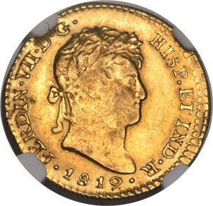 This specimen was lot 31382 in Heritage sale 3041 (Chicago, August 2015), where it sold for $1,527.50. The catalog description[1] noted, "Ferdinand VII gold Escudo 1819 Mo-JJ AU58 NGC, Mexico City mint. A lustrous selection with a minimal amount of wear atop the highest points and strong design features for the type. Highly-collectible in this nearly-uncirculated designation. Ex. Eliasberg Collection. From The Rudman Collection of Mexican Coins." This type was struck 1814-21 and is usually seen in VF-EF or lower. Jewelry damage is common.