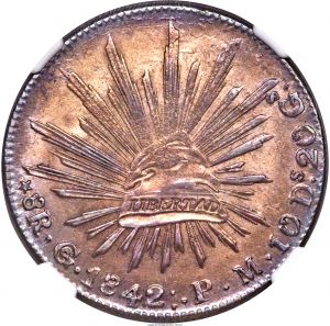This specimen was lot 31194 in Heritage sale 3049 (Long Beach, September 2016), where it sold for $481.75. The catalog description[1] noted, "Republic 8 Reales 1842 Go-PM MS63 NGC, Guanajuato mint. Quite exceptional metallic purple toning along the periphery of the coin, giving this a rather exceptional look. Vibrant and bold, this piece is surely worthy of a premium bid." Assayer PM is listed for 1842-48. Assayer PJ is also listed for 1842.