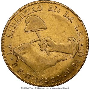 This specimen was lot 32707 in Heritage Sale 3115 (Chicago, May 2024), where it sold for $3,240. The catalog description[1] noted, "Mexico: Republic gold 8 Escudos 1842/32 Do-RM AU55 NGC, Durango mint. A quality example of this elusive Durango 8 Escudos overdate, one of the two of its kind located on the NGC Population Reports. Though the obverse is quite weakly struck, which is not uncommon, the reverse is a bit stronger but more importantly, the light dusky patina is superb and there are no major hits to the coin." While Durango mint eight escudos are not rare, uncirculated eight escudos of Durango are not common compared to those of Mexico City. All known specimens of this date bear the overdate.