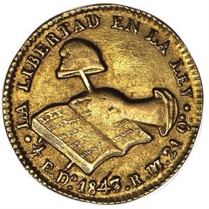 "MEXICO. Republic. ½ Escudo, 1843 Do RM. Durango. Hand inscribing law book with quill and Liberty Cap. Rv. Bold eagle facing r. with snake in beak. An extremely rare date that is seldom offered in any grade. The present example shows a strong overdate, with a long extension up from the stroke of the 4 into field toward the center spine of the law book, jumble of repunchings under the 3. The strike is decent but a tad flat on the body of the snake where it crosses the eagle's breast, as well as the hand opposite, but the wings, head and cactus are all reasonably sharp. Muted orange-gold color, classically attractive from this old collection. Richard A. Long reports three or four coins of this issue in his Gold Coins of the Early Mexican Republic 1823-1873. We cannot be certain which example this specimen is, or if it is even listed at all; in any event, this is an extreme rarity in any grade. Choice Extremely Fine."