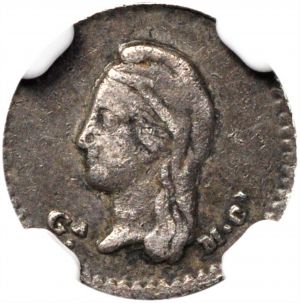 This specimen was lot 71534 in Stack's Bowers Collector's Choice sale (Costa Mesa, CA, October 2021), where it sold for $288. The catalog description[1] noted, "MEXICO. 1/4 Real (Quartilla), 1843-Ga MC. Guadalajara Mint. NGC EF-40. A rather RARE and enticing minor, this wholesome specimen presents amber-gray toning and great originality." This type was struck at Guadalajara 1842-62. "Lion and castle" quarter reals were struck before independence but their issue ceased in 1821. State coppers were meant to fill the gap but their abusive overissue forced the central goverment to issue these tiny silver coins (face value 3¼¢) in an attempt to displace them. They were issued by the Chihuahua (mintmark "Ca", rare), Culiacan (mintmark "C", rare), Durango (mintmark "Do", not common), Guadalajara (mintmark "Ga", common), Guadalupe y Calvo (mintmark "GC", rare), Guanajuato (mintmark "Go", common), Mexico City (mintmark "Mo", common), San Luis Potosí (mintmark "SLPi", common) and Zacatecas (mintmark "Zs", common) mints. Many individual dates are very rare. Counterfeits exist. The conversion to decimal coinage in the 1860's terminated the denomination.