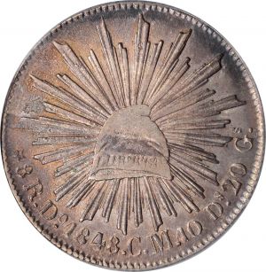 This specimen was lot 72288 in Stack's Bowers Collector's Choice sale (Costa Mesa, CA, June 2021), where it sold for $336. The catalog description[1] noted, "MEXICO. 8 Reales, 1848-Do CM. Durango Mint. PCGS Genuine--Cleaned, EF Details Gold Shield. Despite the minor cleaning, this lightly handled example remains a solid overall representation of the type with pleasing color." The Durango mint struck eight reales 1824-95 and this date is scarce. The SCWC notes an 1848/7 overdate as well as mintmaster RM. This is the most available variety for the date.
