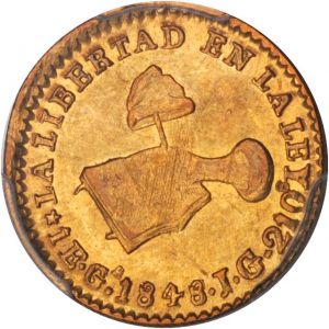 The first specimen was lot 34288 in Ponterio sale 177 (Chicago, August 2013), where it did not sell. The catalog description[1] noted, "MEXICO. Guadalajara. Escudo, 1848/7-GaJG. PCGS AU-58." The Guadalajara mint struck this type 1825-60; the SCWC prices this date only 25% higher than a common Mexico City issue.