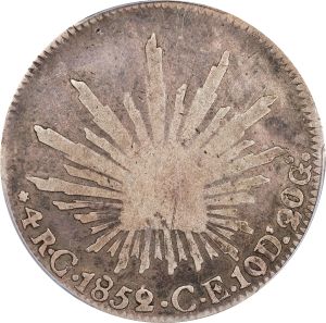 This specimen was lot 73353 in Stack's Bowers Collector's Choice sale (Costa Mesa, CA, February 2024), where it sold for $168. The catalog description[1] noted, "MEXICO. 4 Reales, 1852-C CE. Culiacan Mint. PCGS Genuine--Scratch, Fine Details. Though circulated and with a short scratch over the cap, this piece features clear legends and attractive charcoal toning. A nice representative for this RARE date." The Culiacan mint opened in 1846 to process ore from local mines. Like many other mints, it neglected the production of small change in favor of striking pesos for export. The SCWC reports five dates for the four reales (1846, 1850, 1852, 1858 and 1860) of which only the 1860 is common. Assayer CE operated 1846-70.