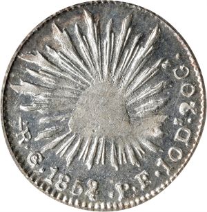 This specimen was lot 72077 in Stack's Bowers Collector's Choice sale (Costa Mesa, CA, June 2022), where it sold for $144. The catalog description[1] noted, "MEXICO. 1/2 Real, 1852/1-Go PF. Guanajuato Mint. PCGS MS-62. A bold overdate. Though a bit soft on strike in the centers, the surfaces of this coin are almost prooflike, with bright, appealing luster throughout." This type was struck at Guanajuato 1826-68, with assayer PF listed for 1848-61. The overdate noted here is mentioned in the SCWC with a slight premium.