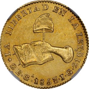 This specimen was lot 51318 in Stack's Bowers ANA sale (Pittsburgh, PA, August 2023), where it sold for $8,400. The catalog description[1] noted, "Enchanting Mint State Tapatio Minor in Gold. MEXICO. 2 Escudos, 1853-Ga JG. Guadalajara Mint. NGC MS-61. A VERY RARE and elusive type, especially in a charming, elevated state of preservation as is the case here, this Mint State specimen yields shimmering surfaces and a vibrant golden-yellow color, with a breathtaking level of originality. Undoubtedly worthy of a supreme bid and intense focus from the specialists within the series." This type is not rare but this is a rare date. Guadalajara struck two escudos 1835-41, 1847-63 and 1870 and is the second commonest mint after Mexico City.