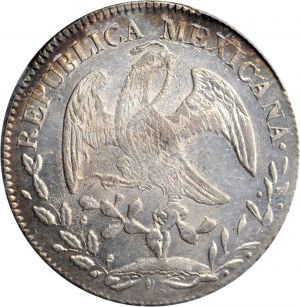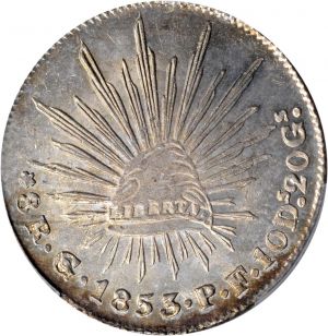 This specimen was lot 45352 in Stack's Bowers ANA sale (Costa Mesa, CA, August 2021), where it sold for $870. The catalog description[1] noted, "MEXICO. 8 Reales, 1853-Go PF. Guanajuato Mint. PCGS MS-63 Gold Shield. Reflective surfaces, especially on the obverse; lightly toned with "pull away" around the letters. Our first offering of this date." The regular date is common while the 1853/2 overdate is slightly scarce.