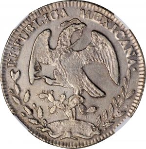 This specimen was lot 73204 in Stack's Bowers Collector's Choice sale (Santa Ana, CA, June 2020), where it sold for $204. The catalog description[1] noted, "MEXICO. 8 Reales, 1854-Pi MC. San Luis Potosí Mint. NGC AU Details--Cleaned. Medal alignment. Some light cleaning is noted, but this example has started to re-tone quite pleasingly. An important date within the series." The specimen shown is an 1854Pi-MC eight reales from the San Luis Potosí mint, which struck the type 1827-93. This date is one of several scarce dates (1849-60) issued during the War of the Reform. The earlier issues of 1831-48 and later issues of 1861-93 are more available. The San Luis Potosí mint closed in 1895, having struck most of the silver and copper denominations but never issued gold. The SCWC lists no overdates or varieties for the year.