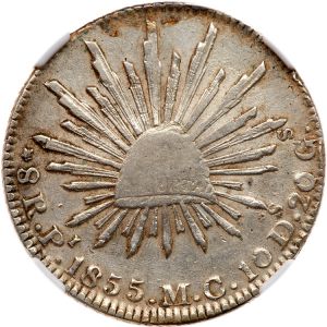 This specimen was lot 2306 in Goldberg sale 106 (Los Angeles, September 2018), where it sold for $78. The catalog description[1] noted, "Mexico. 8 Reales, 1855-Pi MC. NGC graded Extremely Fine Details (Cleaned)." This date is fairly scarce but somewhat available.