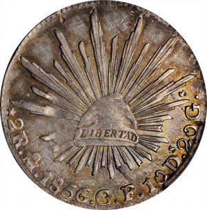 This specimen was lot 24224 in Stack's Bowers NYINC sale (Newport Beach, CA, January 2021), where it sold for $105. The catalog description[1] noted, "MEXICO. 2 Reales, 1856/5-Mo GF/GC. Mexico City Mint. PCGS AU-58 Gold Shield. A pleasing, barely circulated example of the type, with both an overdate and an over-assayer, with warm sunset toning colors in the fields." The Mexico City mint struck two reales 1825-37, 1840-42, 1847-63, 1867-69. This mint is awarded little premium by the SCWC yet is much less often seen than Guanajuato or Zacatecas. The exception is the 1861-Mo CH, which is the only republic two reales common in Gem BU. This date is listed only with the overdate and overassayer.