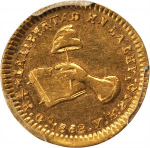 This specimen was lot 23333 in Stack's Bowers ANA sale (Philadelphia, August 2018), where it sold for $240. The catalog description[1] noted, "MEXICO. 1/2 Escudo, 1862/1-GoYE. Guanajuato Mint. PCGS MS-61 Secure Holder. Pleasing quality, possessing bright tone over the surfaces and bold dentilation at the edges that attractively frames the central designs. The finest graded example of this date at PCGS." The Guanajuato mint struck half escudos 1845, 1849-63 and is generally considered a slightly scarce mint.