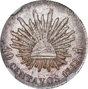 This specimen was lot 71360 in Stack's Bowers Collectors Choice sale (Costa Mesa, CA, October 2025), where it sold for $31,200. The catalog description[1] noted, "MEXICO. Silver 10 Centavos "Pattern", 1863-Mo. Mexico City Mint. Cap and Rays Type. NGC MS-66. Only graded by NGC. Very rare pattern and almost surely the finest known. From the Kirk Menczer Collection of Republican Decimal Minors. Ex: Pablo Gerber Collection." This cap-and-rays design was used for production 1867-69 at Mexico City and San Luis Potosi after the French had been expelled. Other early efforts, such as this product of Chihuahua (KM 401.1), used a value reverse, correctly assuming that the cap-and-rays ten centavos would be confused with the one real. A similar five centavos pattern exists (KM Pn94).