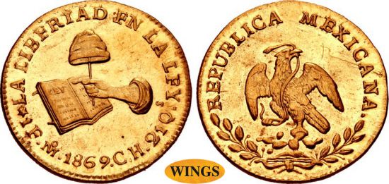 This specimen was lot 1922 in Classical Numismatic Group's auction of the Richard Lissner collection (Chicago, August 2014), where it sold for $968. The catalog description[1] noted, "MEXICO, Segunda República. 1867-1905. AV Escudo. Ciudad de México (Mexico City) mint. Dated 1869 Mo CH. In NGC encapsulation graded MS 64. Choice prooflike fully lustrous brilliant uncirculated. A great type coin and highest grade for the date. Only one 1825 graded higher at 65 for the type. Purchased from M. Louis Teller, June 1974." The Mexico City mint struck this type 1825-69 and this date is priced by the SCWC as a common issue. An issue from Culiacan in 1870 terminated the denomination.