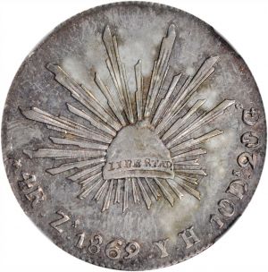This specimen was lot 71522 in Stack's Bowers Collector's Choice sale (Costa Mesa, CA, October 2021), where it sold for $600. The catalog description[1] noted, "MEXICO. 4 Reales, 1869-Zs YH. Zacatecas Mint. NGC AU-55. Pale violet and olive decorate the steel gray devices of this stately minor. Pools of brilliance are still retained, as handling is minimal and relegated to the high points. Sharply struck and well deserving of the Choice About Uncirculated grade." Shown is an 1869Zs-YH four reales, a late date of a type struck at the Zacatecas mint 1830-70. Assayer YH is recorded for 1868-74. Ten mints (Mexico City, Guanajuato, Zacatecas, Potosi, Oaxaca, Hermosillo, Real del Catorce, Guadalupe y Calvo, Guadalajara and Culiacan) struck this type of which Guanajuato is tied with Zacatecas as the commonest mint. This date is common but, like all four reales, rare in choice condition.
