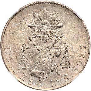 Shown is a balance scale peso, of a type struck 1869-1873. It was not a success in the export market, the destination for most of Mexico's silver, so the type was discontinued in 1873 in favor of the resumption of the "cap and ray" eight reales. This specimen was lot 2274 in Goldberg sale 93 (Los Angeles, September 2016), where it sold for $305.50. The catalog description[1] noted, "Mexico. Peso, 1871-Zs H NGC MS61. Balance scale. Lustrous. NGC graded MS-61." This issue from Zacatecas is among the common dates. Other mints include Culiacan (scarce), Oaxaca (scarce), Mexico City (common), Chihuahua (scarce), Guadalajara (rare), Durango (scarce), Guanajuato (common) and Potosi (scarce).