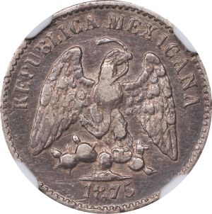 This specimen was lot 71091 in Stack's Bowers Collectors Choice sale (Costa Mesa, CA, October 2025), where it sold for $1,560. The catalog description[1] noted, "MEXICO. 5 Centavos, 1875-Cn P. Culiacan Mint. NGC EF Details--Cleaned. Tied for best of only two examples in NGC Census. Nicely toned with die rust on reverse. Very rare date missing in most major collections including Banco de Mexico. From the Kirk Menczer Collection of Republican Decimal Minors." Shown is an 1875-CN P five centavos, of a type struck 1871-76 and 1886-97. This issue from Culiacan is a rare date.