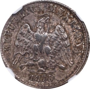 This specimen was lot 71440 in Stack's Bowers Collectors Choice sale (Costa Mesa, CA, October 2025), where it sold for $264. The catalog description[1] noted, "MEXICO. 10 Centavos, 1875-Zs A. Zacatecas Mint. NGC AU-50. Finest of three graded by NGC, others are VF or less. From the Kirk Menczer Collection of Republican Decimal Minors." This specimen is the first common date of a series struck 1870-97 at the Zacatecas mint. This ten centavos piece replaced the silver one real struck since colonial times. Several transitional designs were issued 1863-70, including one by the Maximilian regime, before settling on this type. It, in turn, was replaced by a ten centavos piece with a redesigned reverse in 1898.